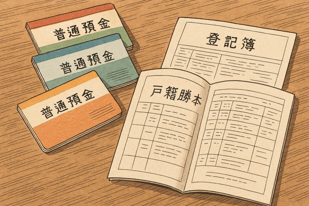 被相続人(亡くなった人)の戸籍謄本等や不動産の登記事項証明書等、預金通帳や残高証明書など、必要な書類をご説明します。