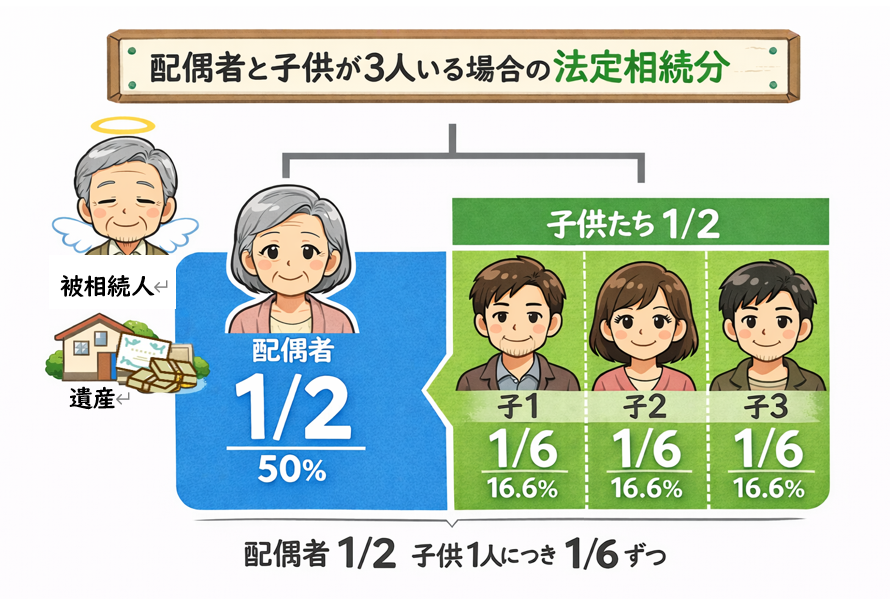 第一順位の「配偶者と子供がいる場合」には、配偶者が1/2子供も1/2になりますので、もし子供が3人いた場合なら、子供1/2×人数3人1/3=1/6となり、それぞれの子供が1/6の相続分となります。「相続人が子供だけの場合」は子供の数で等分になります。