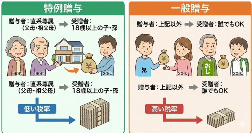 贈与税は贈与者と受贈者(贈与を受けた人)の関係等によって、二つの税率が存在するってご存じでしたか?平成25年の税制改正(施行は平成27年1月以降)によって、それまでの税率(一般税率)に加えて特例税率が創設されました。同時期に改正された相続税の基礎控除額の引き下げが行われたことに関連して生前贈与を促す狙いがあったと考えられます。被相続人の高齢化に伴って相続人も60歳を超えるような「老老相続」が増えたことから、多くの資産を有する高齢者の財産を世代を飛ばして孫に移しやすくした、とも言えます。