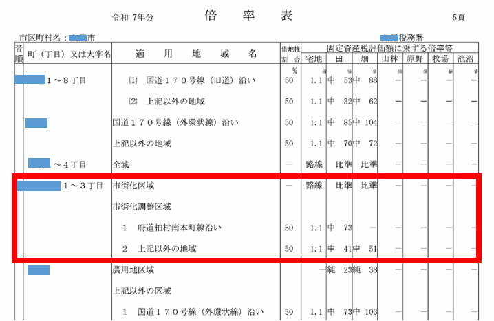 この表が評価倍率表(簡易に”倍率表”と記載されています。)ですが、必ず左から右へ確認していきます。町名を見ると同じ町名でも「〇丁目」とついている場合とそうでない場合があるので注意です。適用地域名の中で最初に確認するのは①市街化区域、②市街化調整区域、③農用地区域、のどこに評価する土地が存在しているかです。もし、分からなければ市町村に確認されたほうが良いと思います。